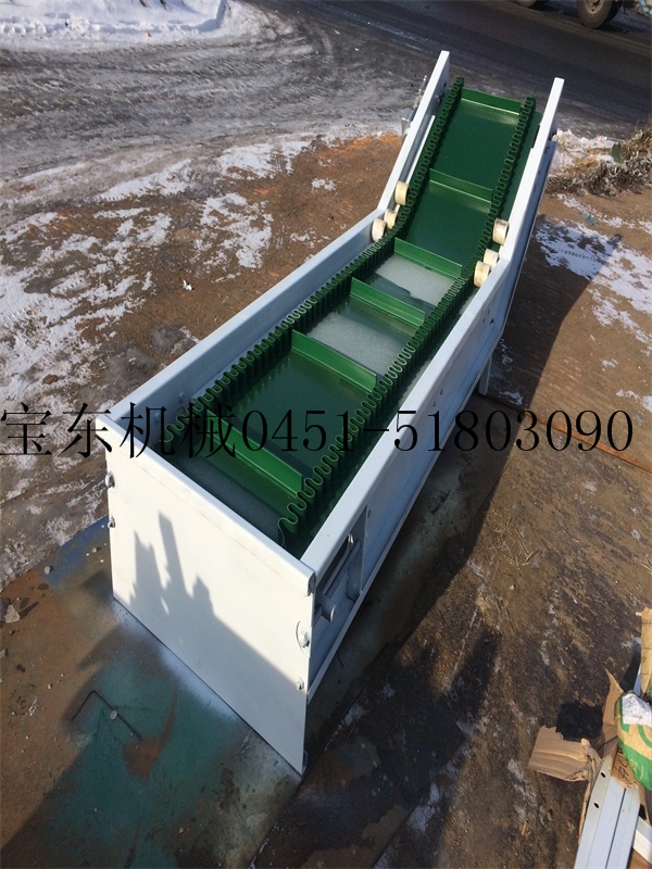 (1)、爬坡輸送機為一般用途的散狀物料連續(xù)輸送設(shè)備,但采用的是具有波狀擋邊和橫隔板的輸送帶。因此,特別適用于大傾角及垂直90°輸送。